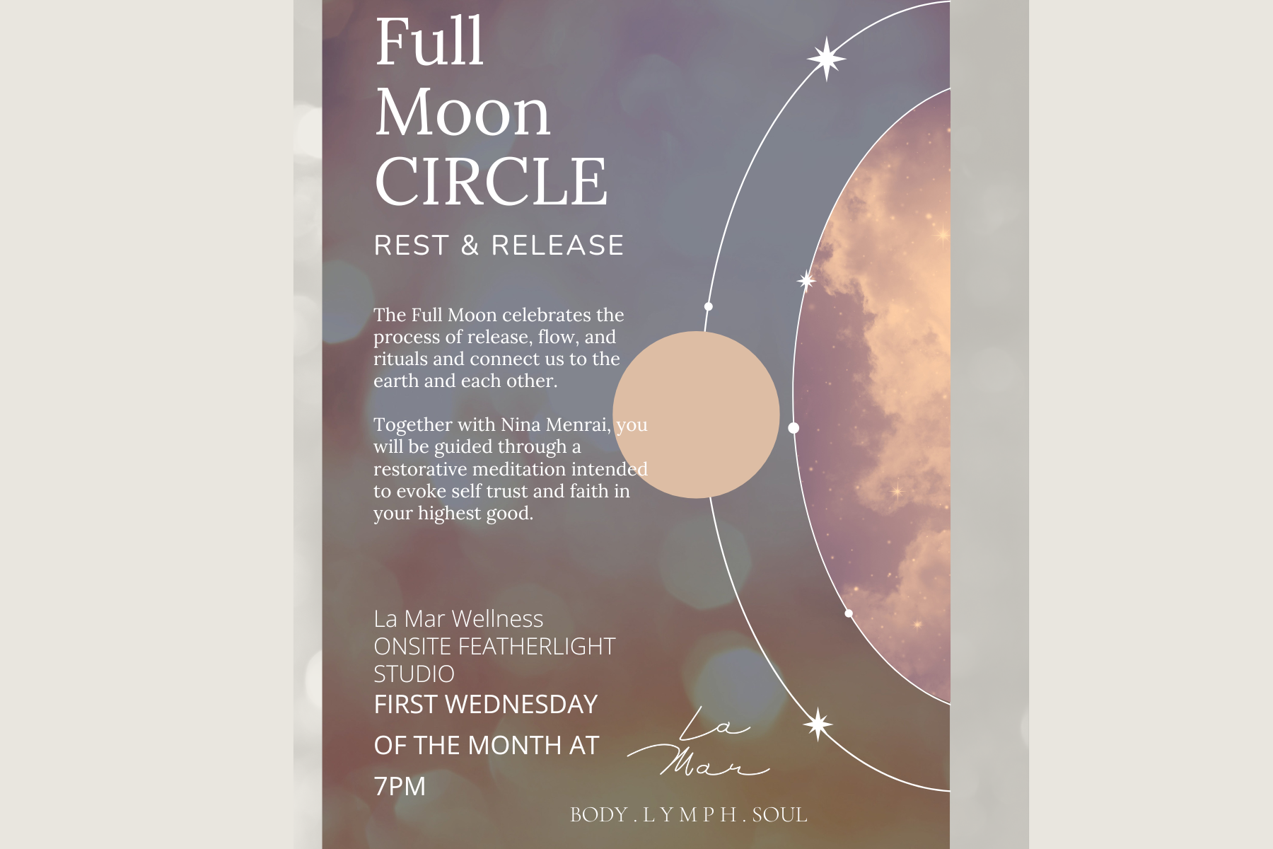 A monthly ritual aligned with the lunar cycle, offering space for reflection, release, and connection. Guided prompts and shared presence invite you to slow down, listen inward, and move with the rhythm of the season.